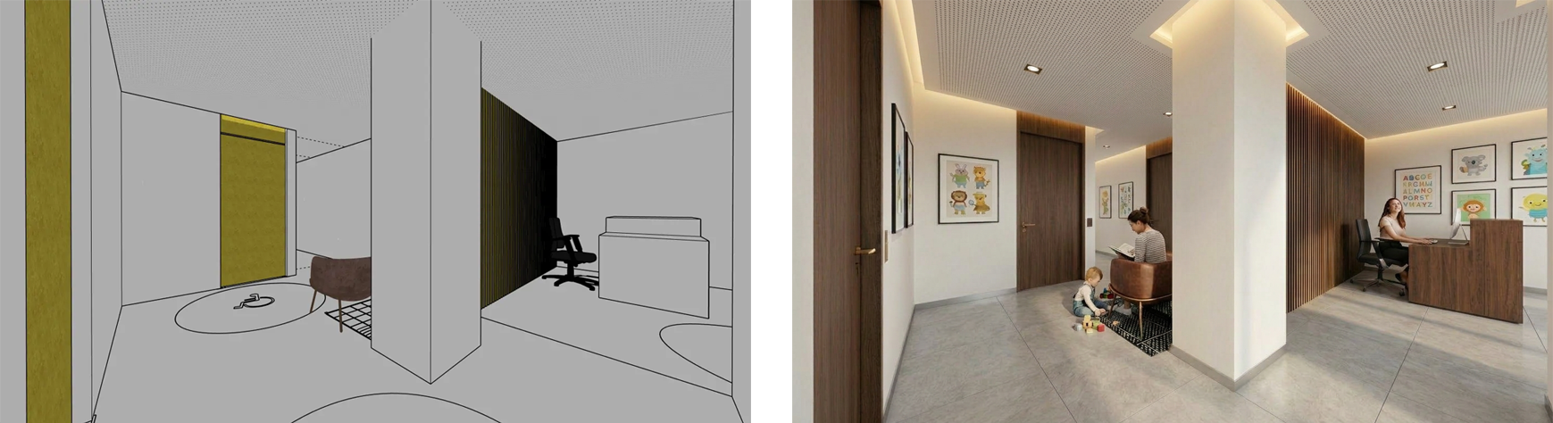 Prompt: Mantener la composición, perspectiva y proporciones originales de la imagen base, realizando únicamente las siguientes modificaciones de diseño e interiorismo. Carpinterías: Sustituir las puertas existentes por puertas lisas de madera, sin molduras ni panelados. Mostrador: El mostrador debe tener el mismo color y acabado que la madera presente en las puertas, generando una imagen uniforme y consistente. Techo: El falso techo debe resolverse como techo acústico microperforado continuo con dowlight dispuestos de forma regular en el centro de cada tramo visible y un foseado perimetral para inclusión de iluminación LED con una temperatura de color cálida. Pavimento: Eliminar las marcas de accesibilidad / minusválidos del suelo. Sustituir el pavimento por baldosas porcelánicas de gran formato imitación hormigón, con juntas mínimas. Decoración: Incorporar cuadros decorativos en la escena considerando una actividad infantil, integrados de forma natural en las paredes. Integración visual: Mantener coherencia de iluminación, materiales y sombras, generando una imagen interior limpia, equilibrada y arquitectónicamente realista.