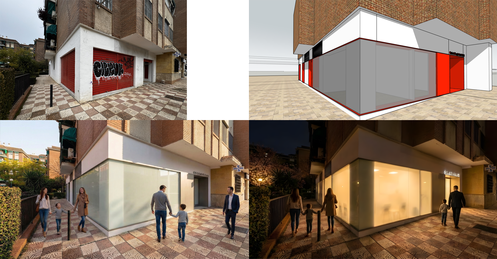 Prompt: Utiliza la imagen #1 como base, respetando completamente su composición, encuadre y punto de vista de cámara. Inserta la perspectiva arquitectónica de la imagen de referencia #2 dentro de la zona marcada en azul en la imagen #1, utilizando como fuente la zona marcada en rojo de la imagen #2. Corrección geométrica: Corrige la ligera curvatura presente en la fachada de planta baja de la imagen de referencia #2, de modo que la fachada resulte perfectamente recta y geométricamente precisa. Integración visual: Ajusta tonos, exposición y contraste para que el elemento insertado se integre de forma natural con la imagen base. Homogeneiza materiales, colores y textura de la imagen final para que parezca una única fotografía coherente. Ajusta las sombras del entorno para que mantengan una dirección de iluminación consistente en toda la escena. Iluminación: Iluminación de amanecer (o atardecer / anochecer según lo que se desee buscar), con luz cálida y suave. Asegura que todas las sombras y reflejos del entorno sean coherentes con esta condición de luz. Atmósfera y presentación: Genera una imagen agradable, atractiva y adecuada para publicación arquitectónica, humanizando sutilmente la escena sin restar protagonismo a la arquitectura. Vidrio de fachada: Utiliza vidrio blanco opaco, que permita intuir muy ligeramente siluetas interiores, sugiriendo el mobiliario interior, sin que los detalles del interior sean claramente visibles. El vidrio debe reflejar el entorno visible de la imagen base #1. Prioridad: