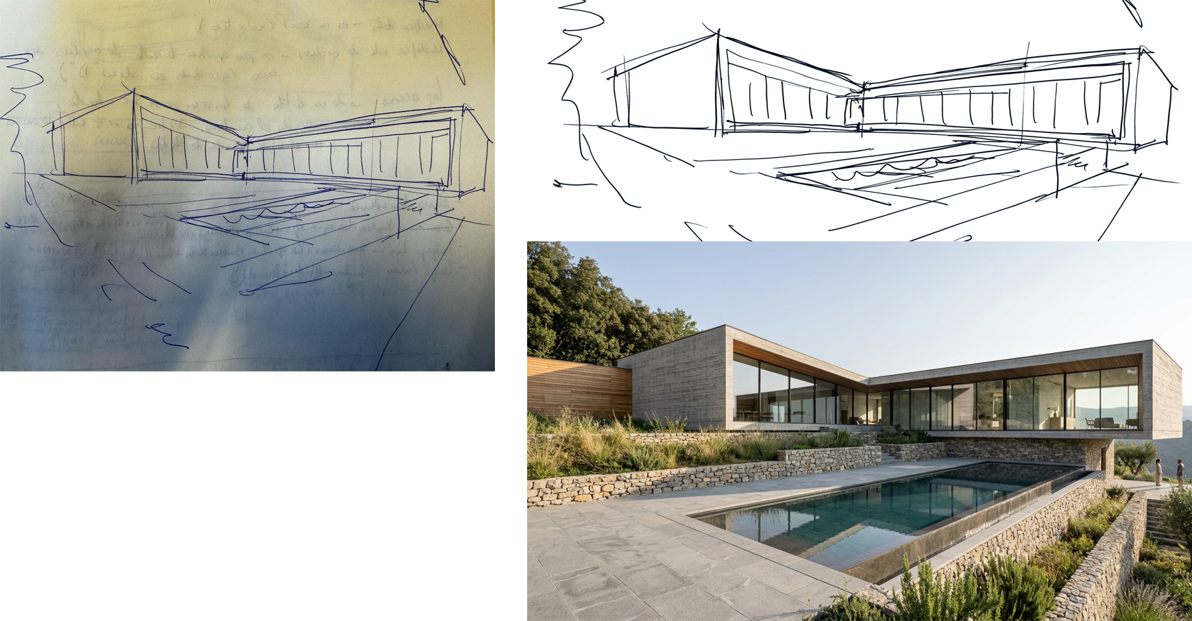 Prompt: Imagen #2 a #3: Genera un render hiperrealista a partir del boceto base, respetando fielmente la volumetría, proporciones y lógica compositiva original. Vivienda unifamiliar contemporánea de un nivel, implantada en un terreno con pendiente acusada. La estrategia de proyecto se basa en la adaptación topográfica mediante plataformas escalonadas y muros de contención de piedra natural colocada en seco, enfatizando la relación entre arquitectura y paisaje. El volumen principal se presenta como una pieza horizontal limpia y precisa. Materialidad honesta y tectónica: hormigón visto con textura de encofrado horizontal, madera natural en planos estratégicos (protecciones solares y cielos exteriores) y grandes superficies acristaladas con carpinterías minimalistas. Delante del volumen, piscina lineal tipo espejo integrada en la plataforma principal, reforzando la horizontalidad y generando reflexión controlada del edificio. Pavimentos exteriores continuos en hormigón fratasado o piedra natural. Vegetación autóctona integrada en los bancales, tratamiento paisajístico sobrio y coherente con el carácter del proyecto. Iluminación natural neutra (luz de tarde suave), atmósfera clara y limpia, sombras definidas que ayuden a leer la volumetría. Humanización muy sutil: presencia mínima de figuras humanas en segundo plano para escala, sin protagonismo. Cámara a nivel peatonal (1,60 m aprox.), lente 28–35 mm sin distorsión, encuadre limpio, composición equilibrada, alto rango dinámico, realismo material preciso, sin efectos artificiales ni estética publicitaria.