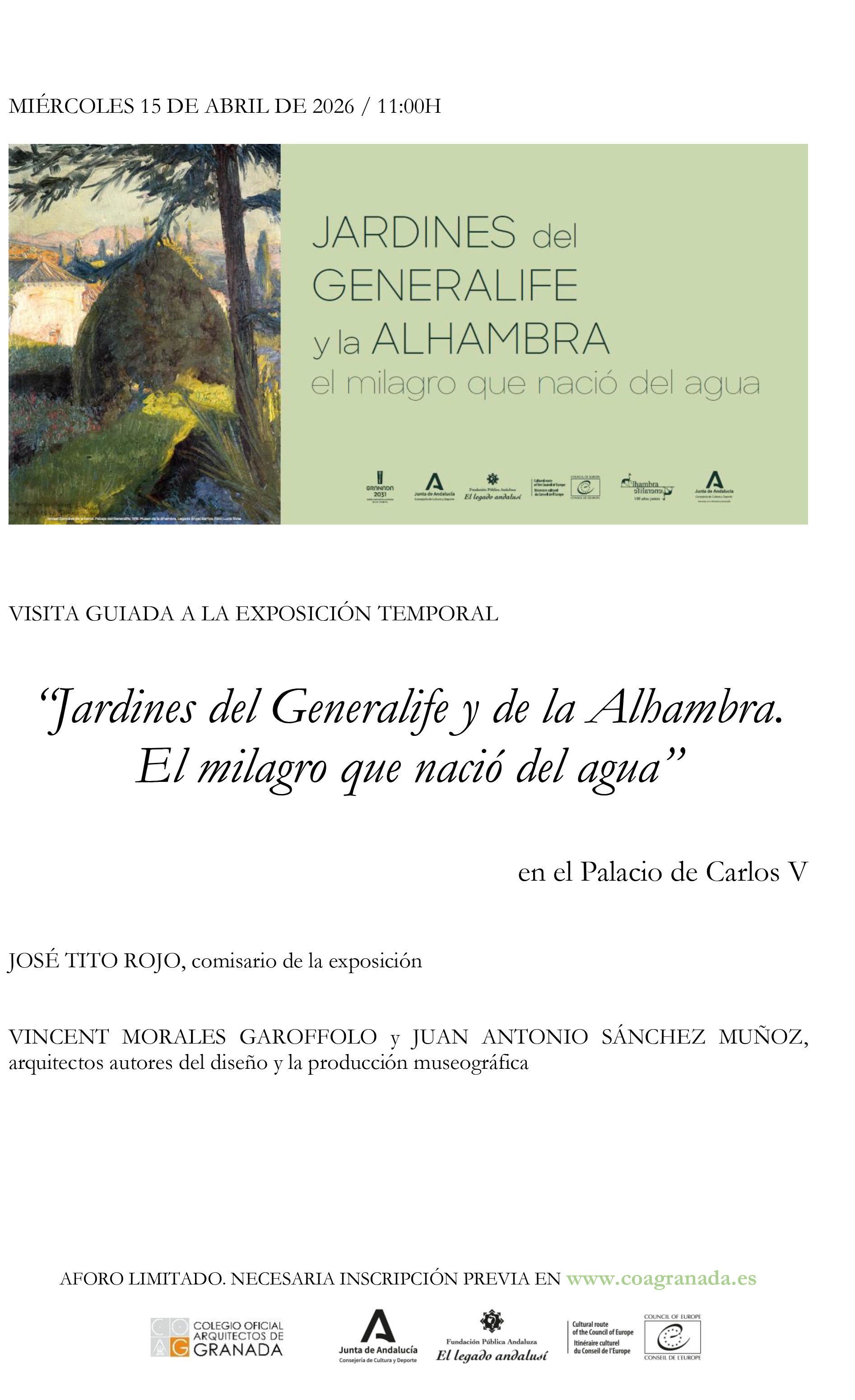 Visita guiada el próximo miércoles 15 de abril a las 11:00h a la exposición temporal “Jardines del Generalife y de la Alhambra. El milagro que nació del agua” en el Palacio de Carlos V, con José Tito Rojo, comisario de la exposición, Vincent Morales Garoffolo y Juan Antonio Sánchez Muñoz, arquitectos autores del diseño y la producción museográfica.