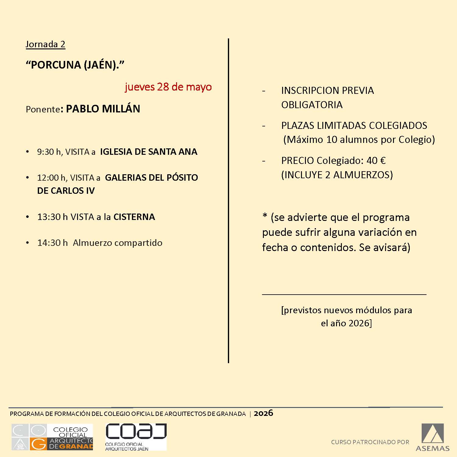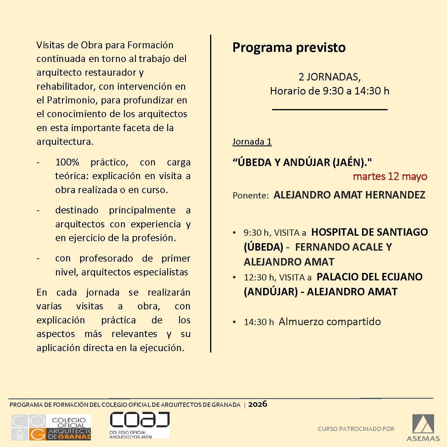 El COAGRANADA, con la participacióón del COAJAÉN organiza estas visitas de Obra para Formación continuada en torno al trabajo del arquitecto restaurador y rehabilitador, con intervención en el Patrimonio, para profundizar en el conocimiento de los arquitectos en esta importante faceta de la arquitectura.